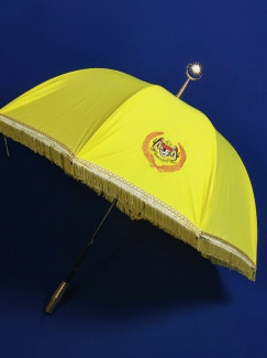 Payung sebanyak 12 kaki diperbuat daripada kain berwarna kuning diraja dengan benang berambu.
